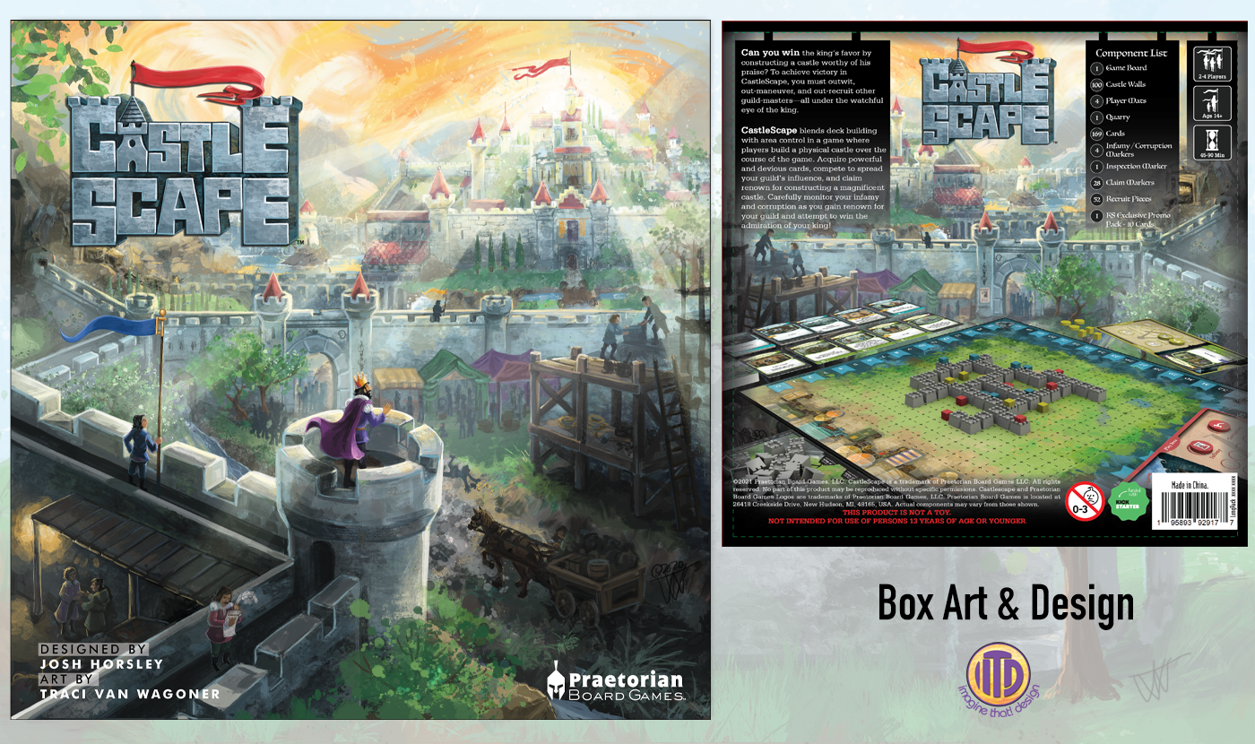 Castle Scape by Praetorian Games is a card drafting game combined with castle building. We did all the character design, illustrations, art, icons, and graphic design for this tabletop game, creating a fantasy world to help players immerse themselves in the game as guild members trying to control the most territory with their castle walls and baileys.